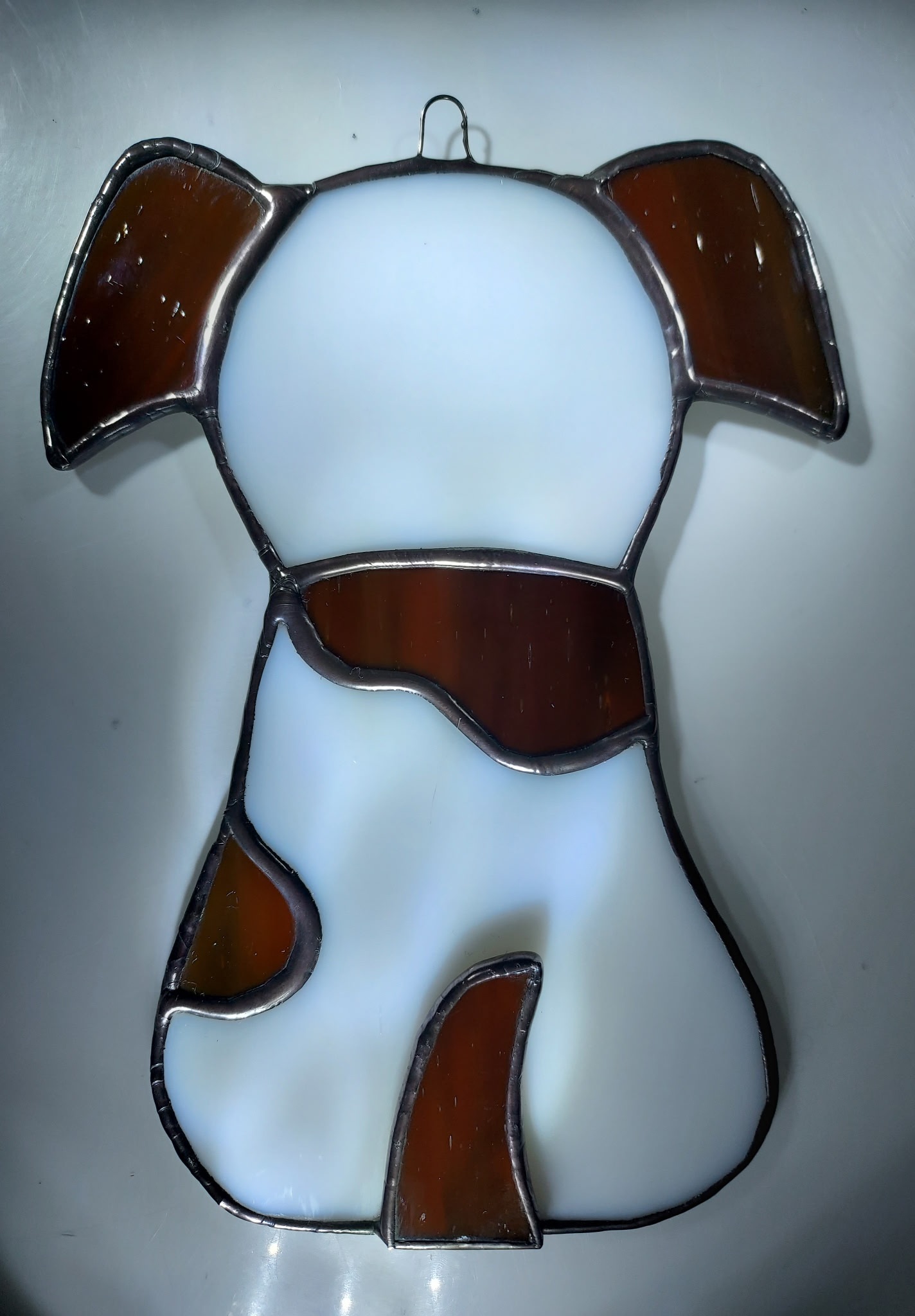 Handcrafted stained glass dog to illustrate that we make custom spotted dogs. This dog, in particular, was made for a customer seeking a white body, caramel spots with caramel ears and tail. The caramel color is showcased in the bright sun.